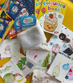 kartki świąteczne, drobne upominki oraz słodycze dla pacjentów