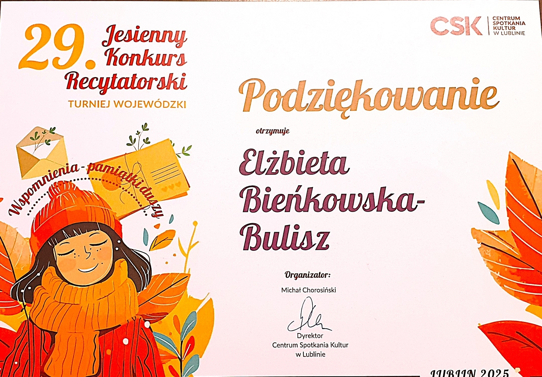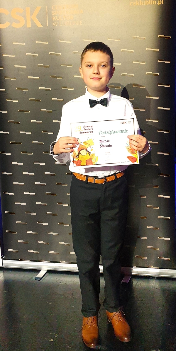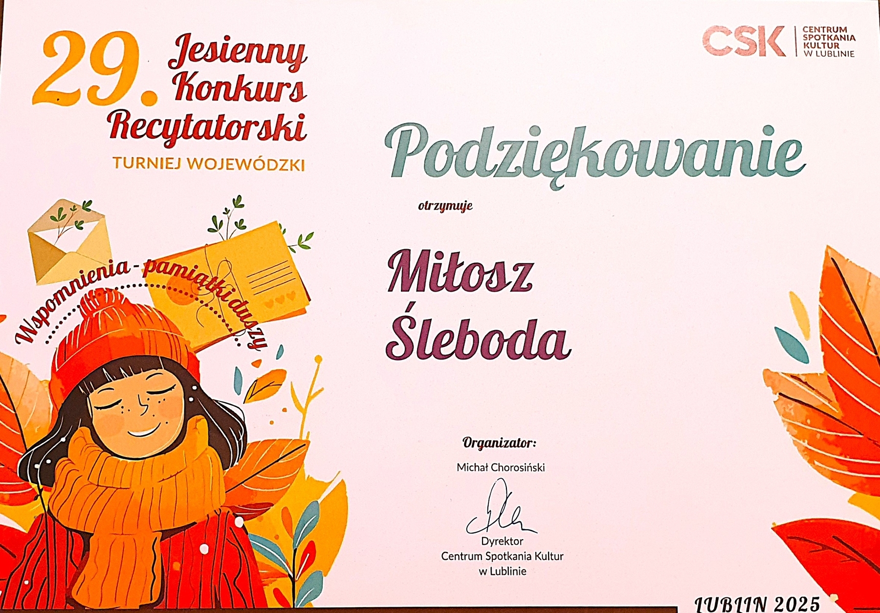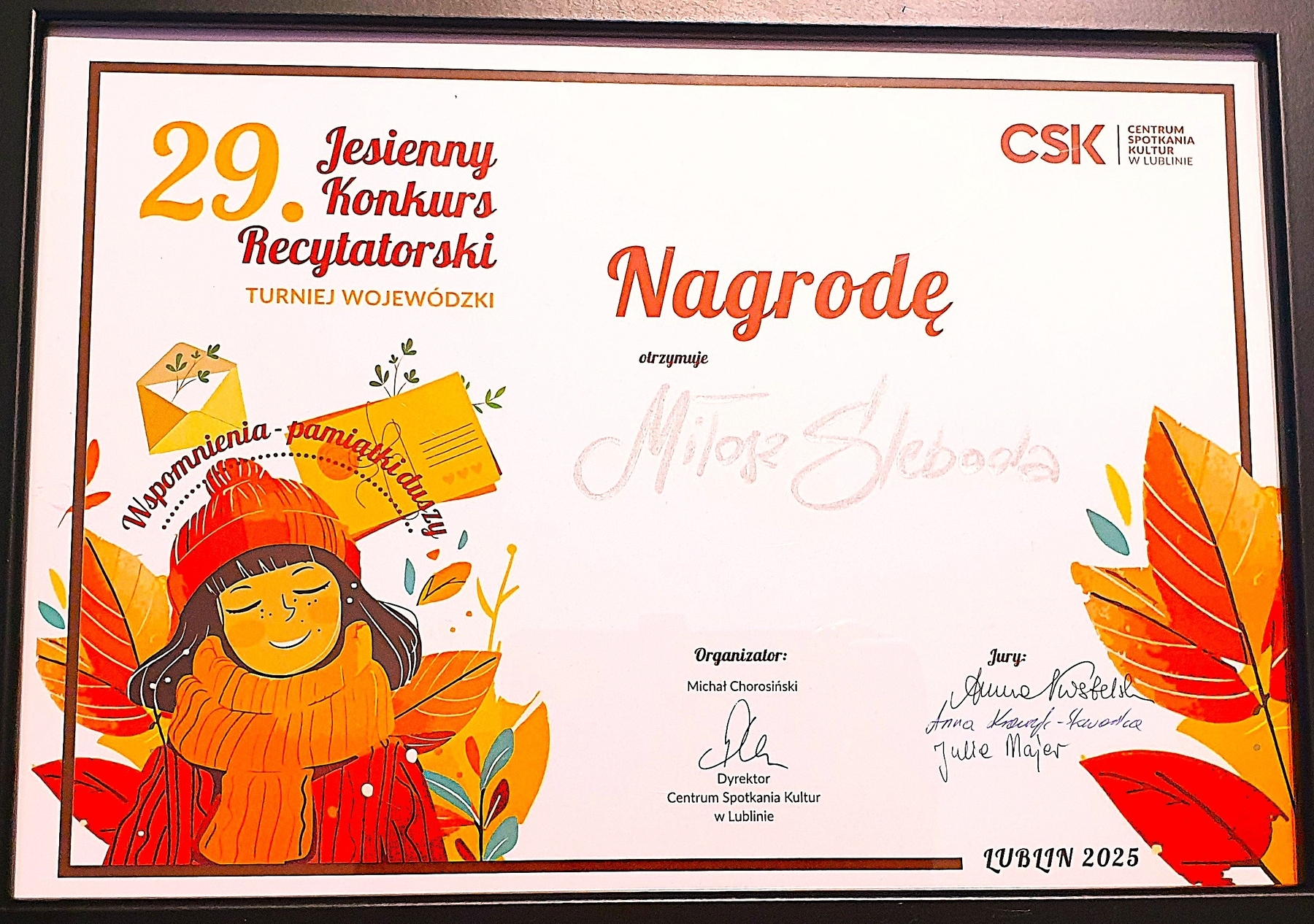 Miłosz Śleboda zwycięzcą ,,29 Jesiennego Konkursu Recytatorskiego'' w Lublinie - Turniej Wojewódzki 21. 11. 2025 r.